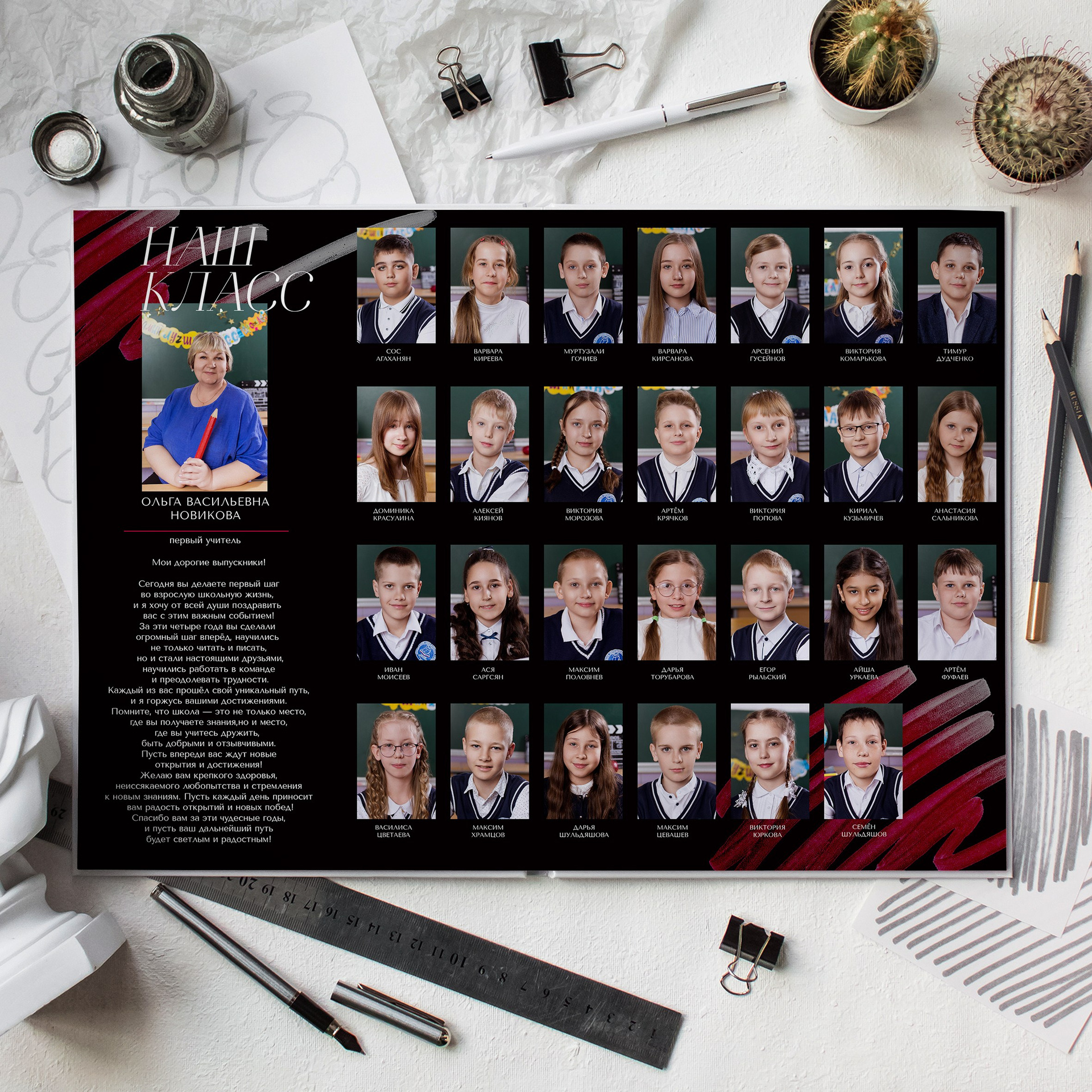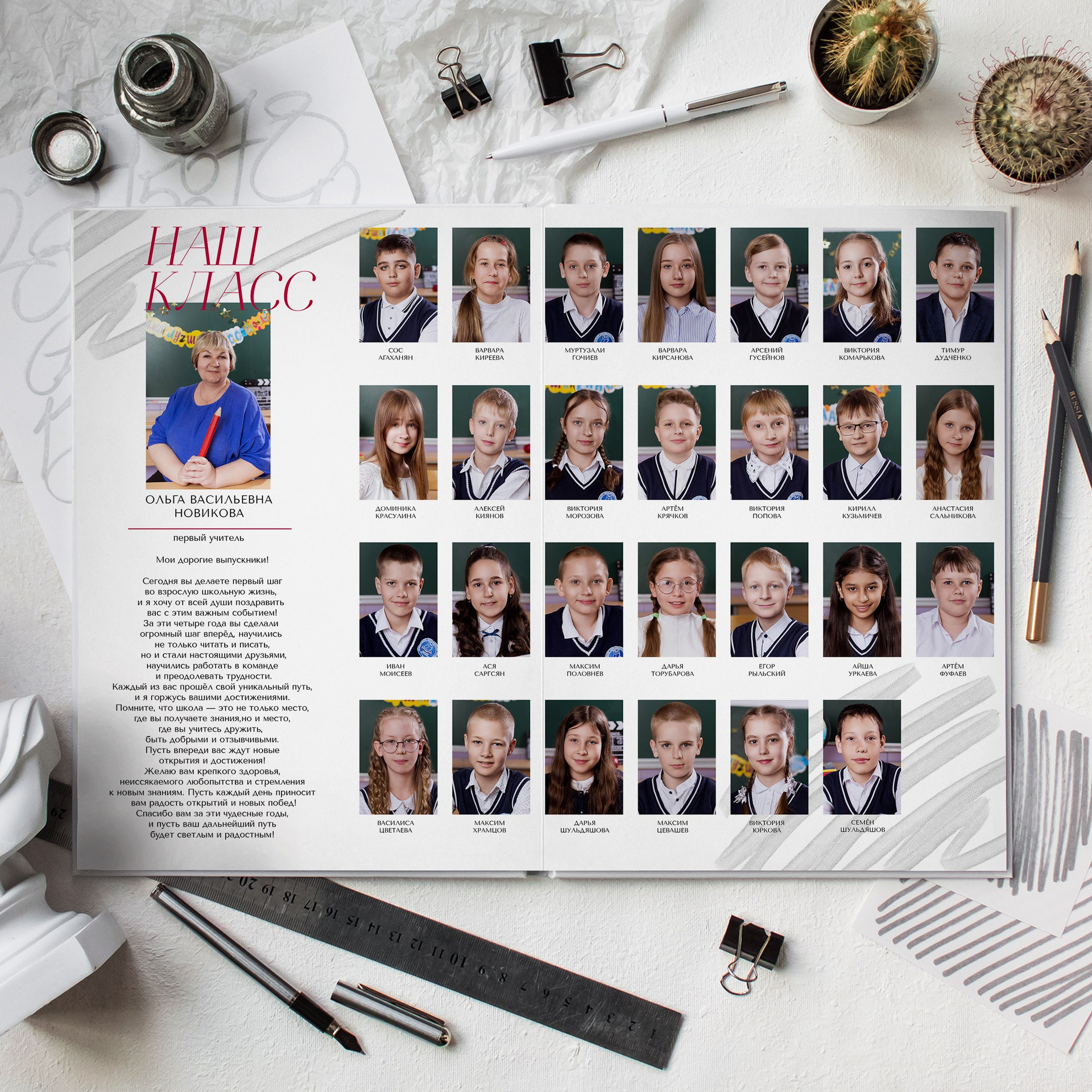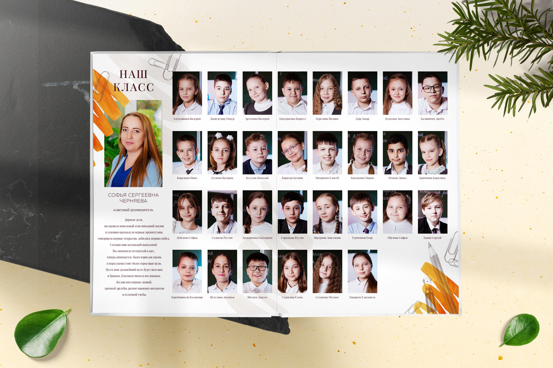 - Виньетка с учителем на весь разворот (2 страницы) (портреты всех детей с подписью фамилий и имён), в зависимости от шаблона, может быть 1 страница виньетка, а на 2-й размещено несколько фото.