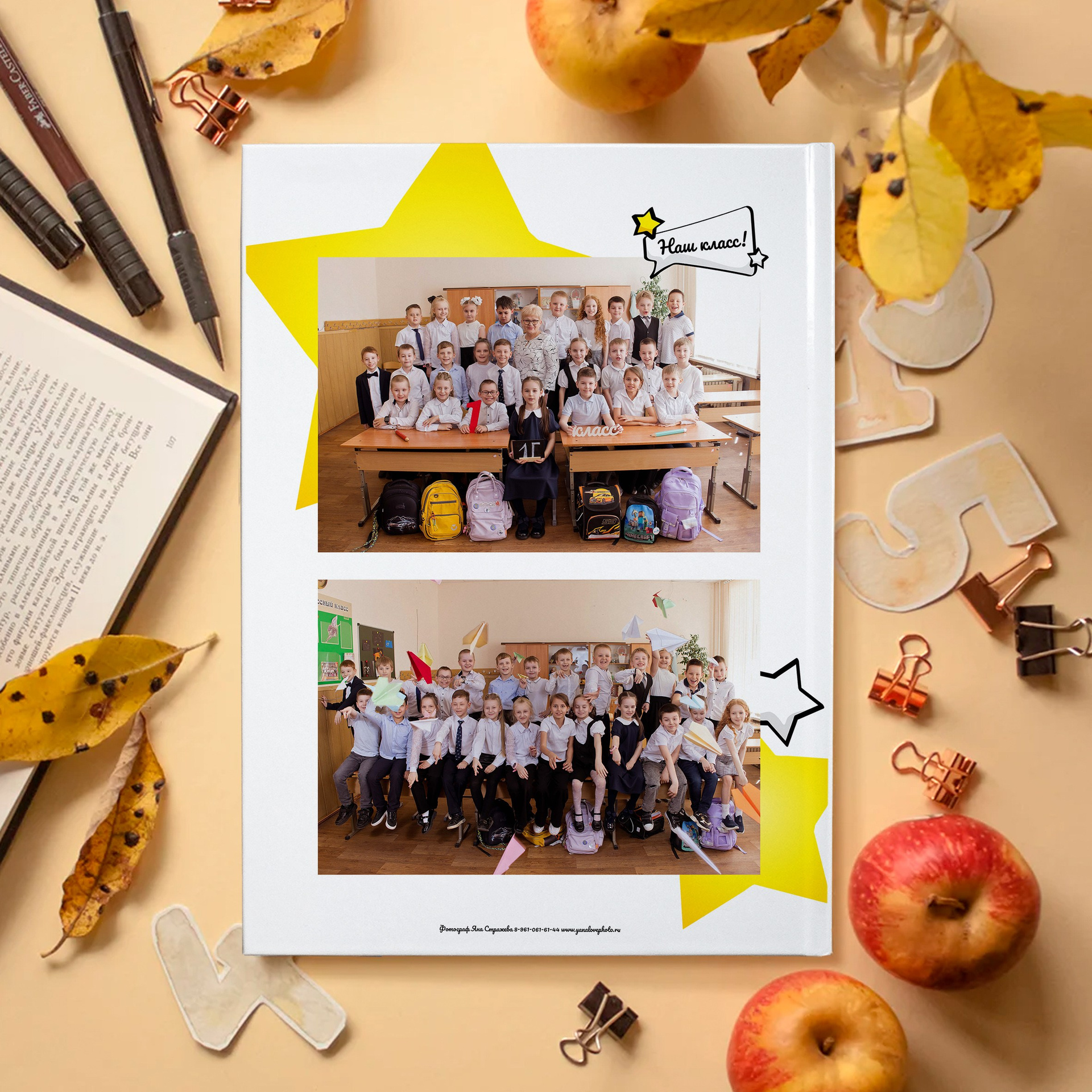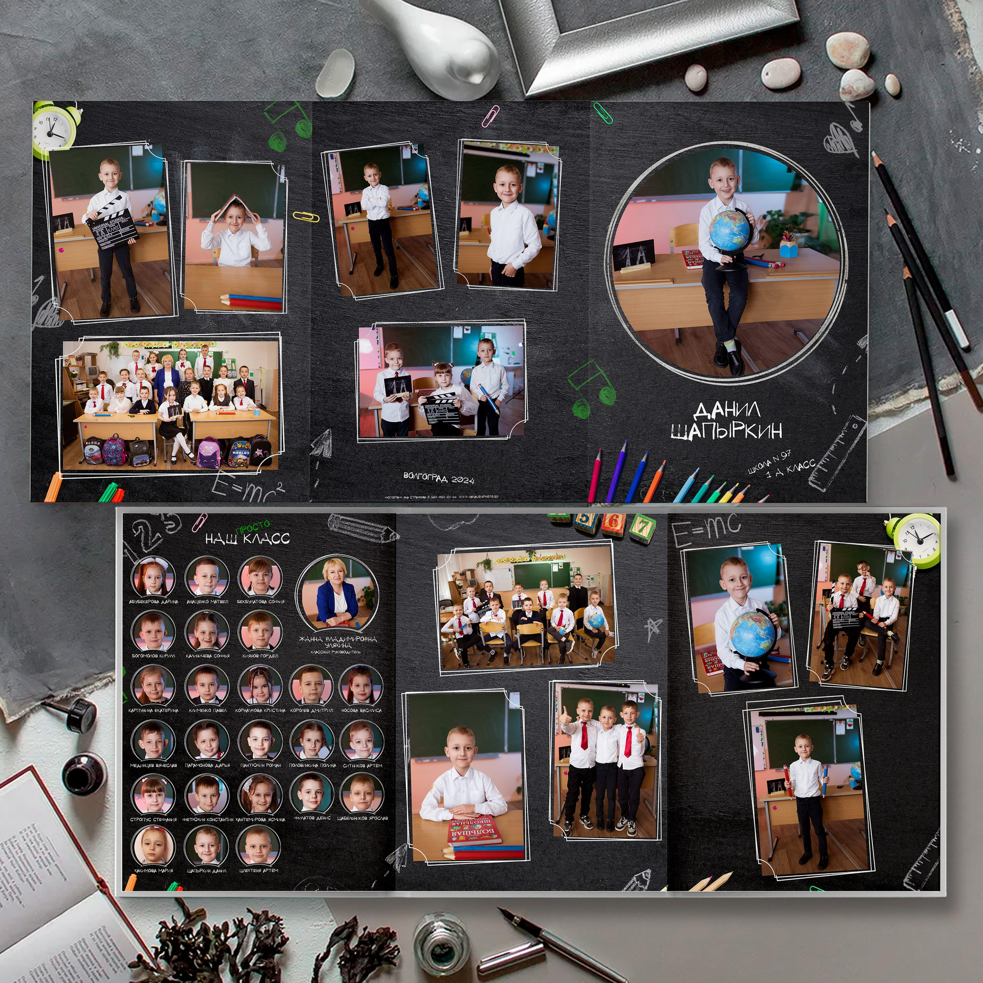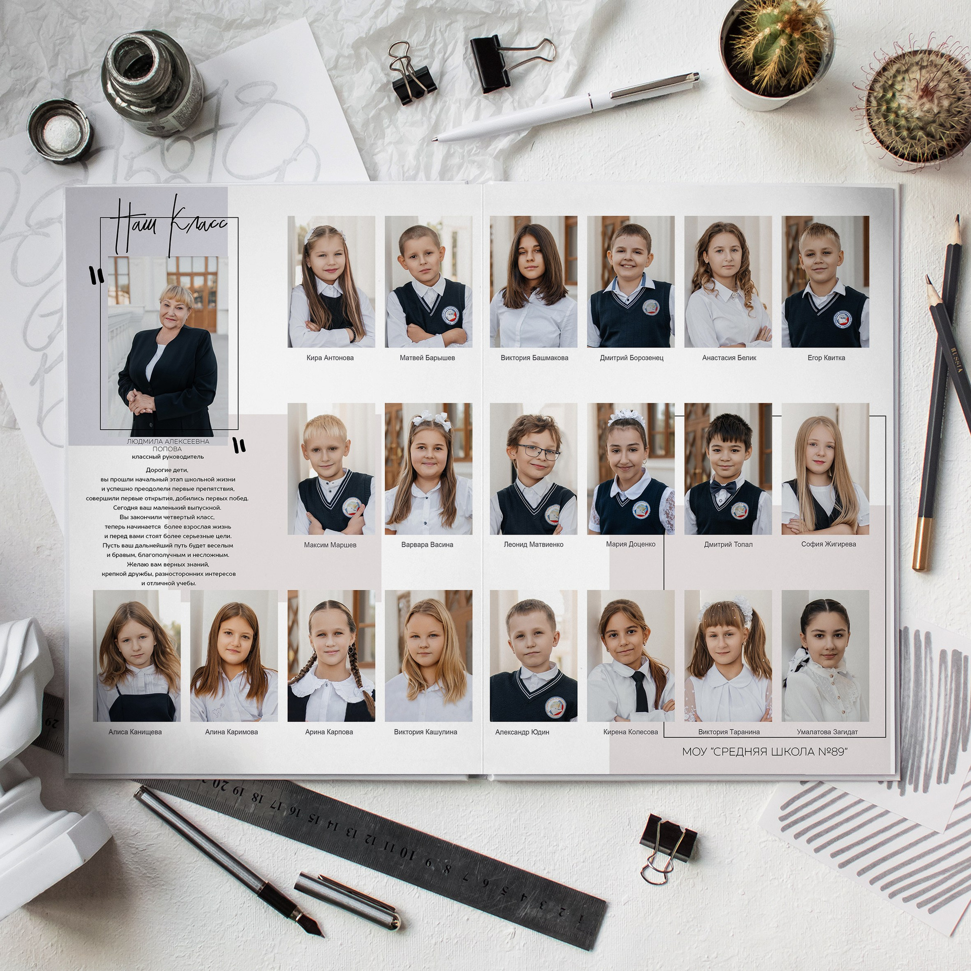 - Виньетка с учителем на весь разворот (2 страницы) (портреты всех детей с подписью фамилий и имён), в зависимости от шаблона, может быть 1 страница виньетка, а на 2-й размещено несколько фото.