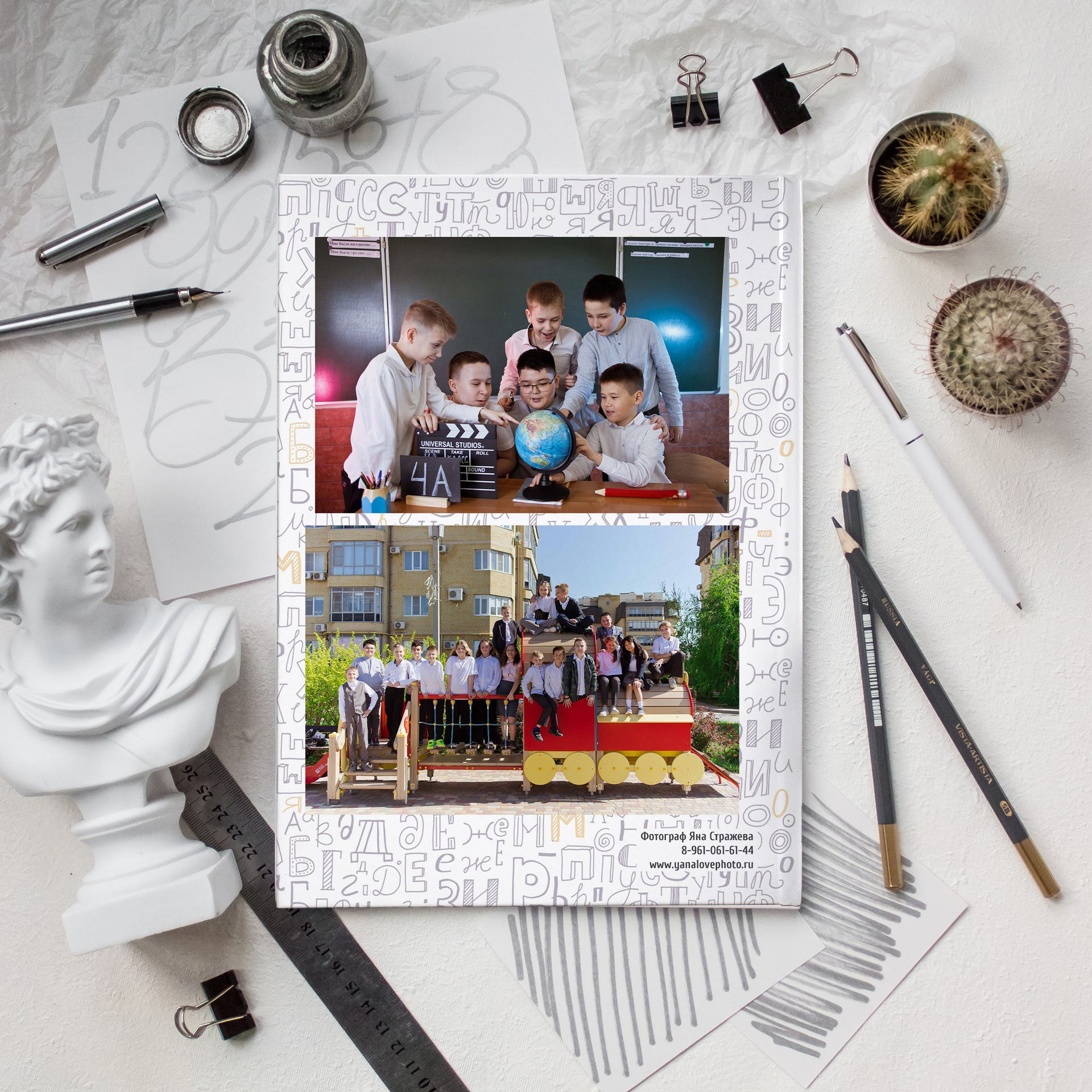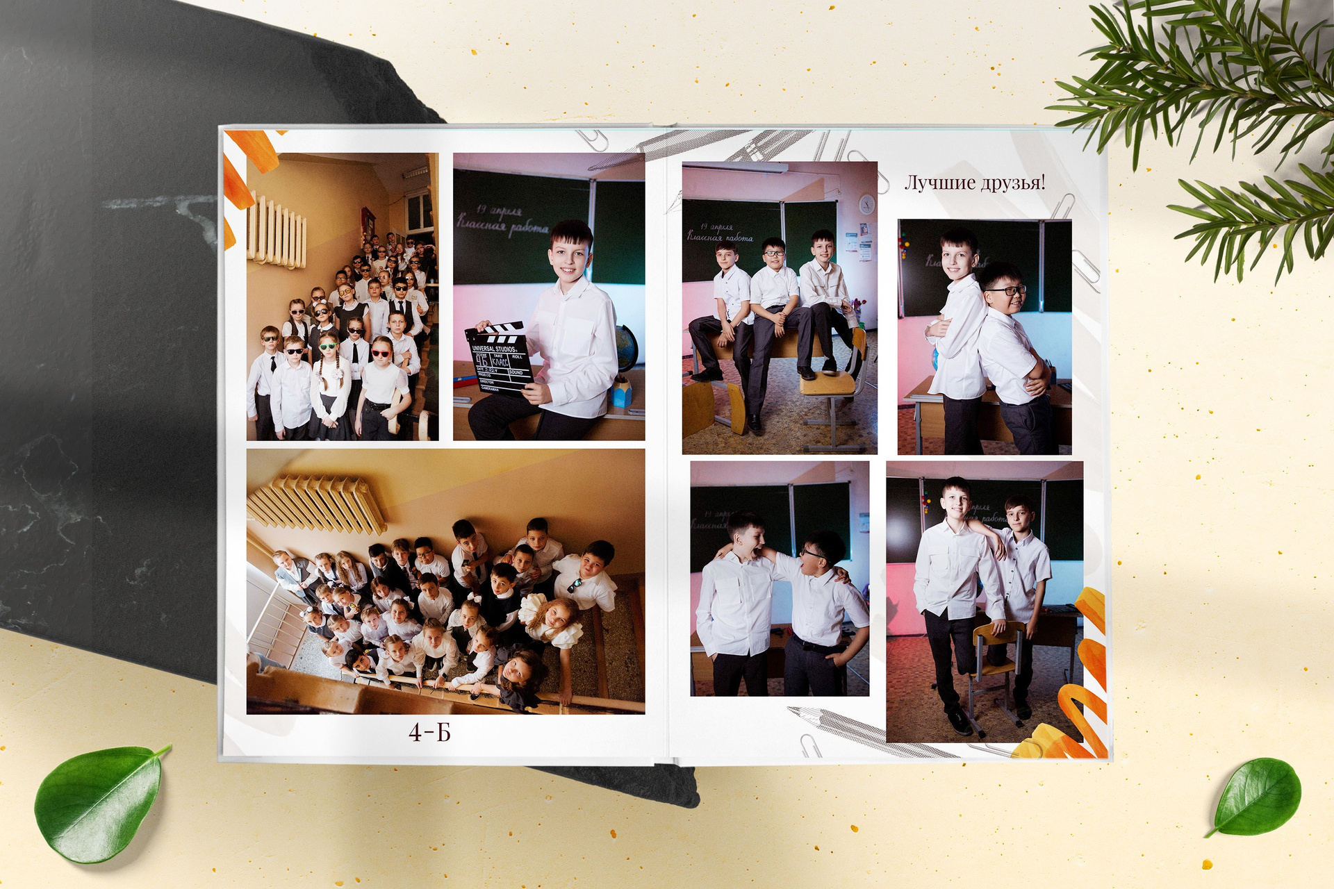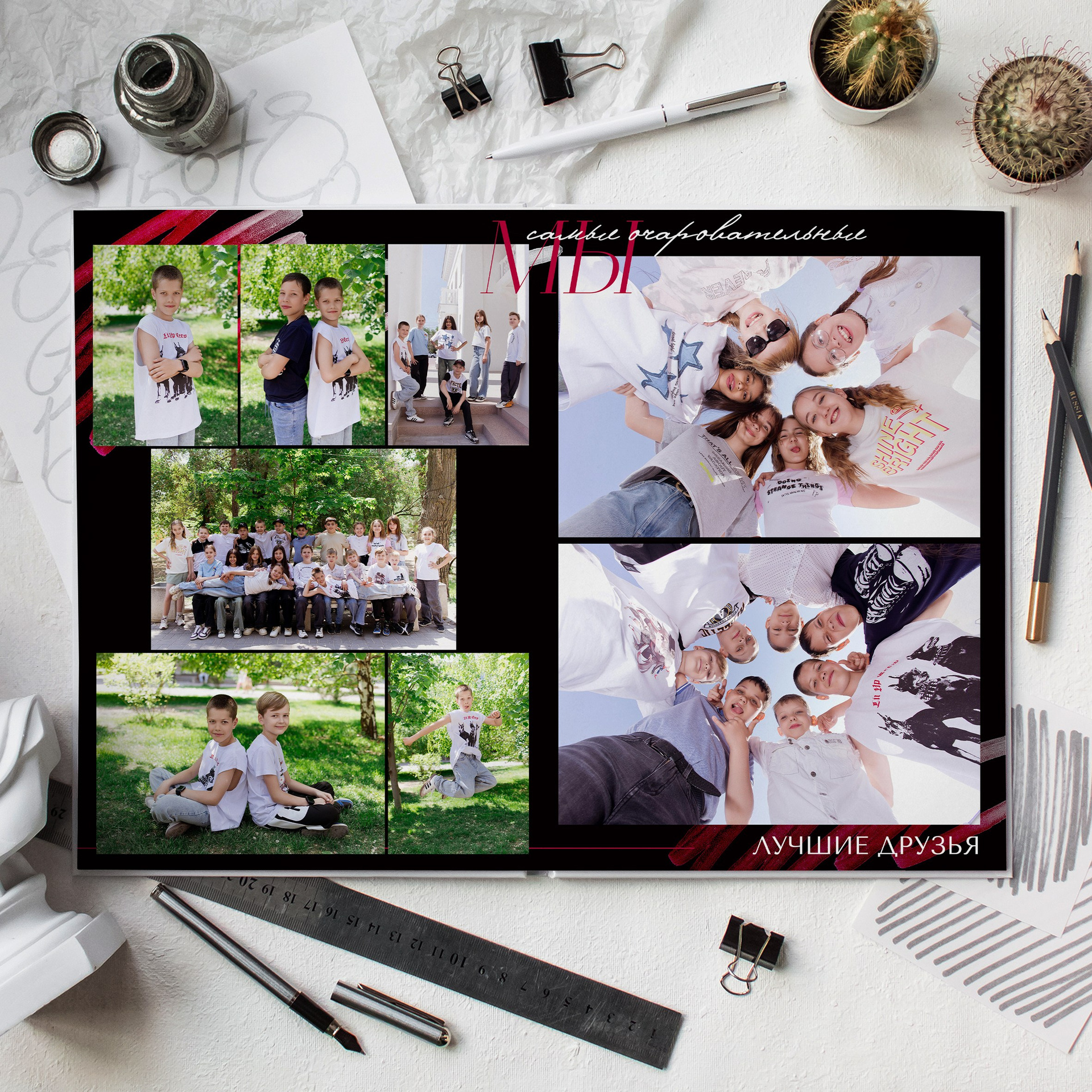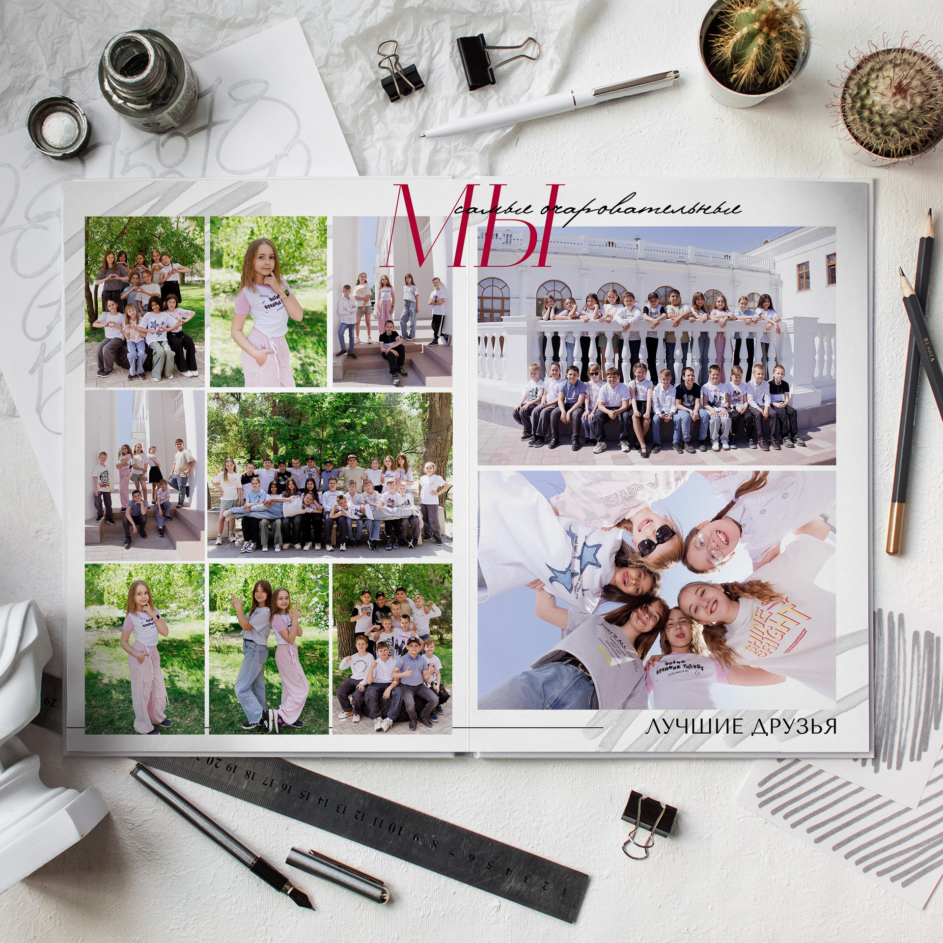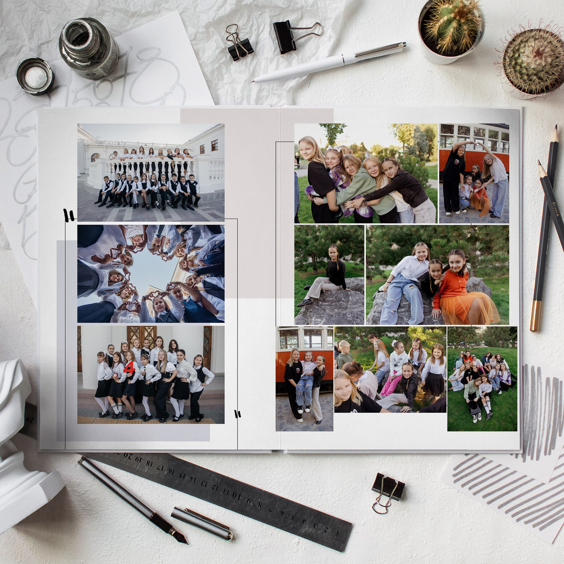 У вас не будет одинаковых по содержанию альбомов, так как каждый макет будет собираться на основе выбранных вами фотографий. Вы решаете, сколько будет разворотов, портретов или фотографий с друзьями и одноклассниками/одногруппниками.