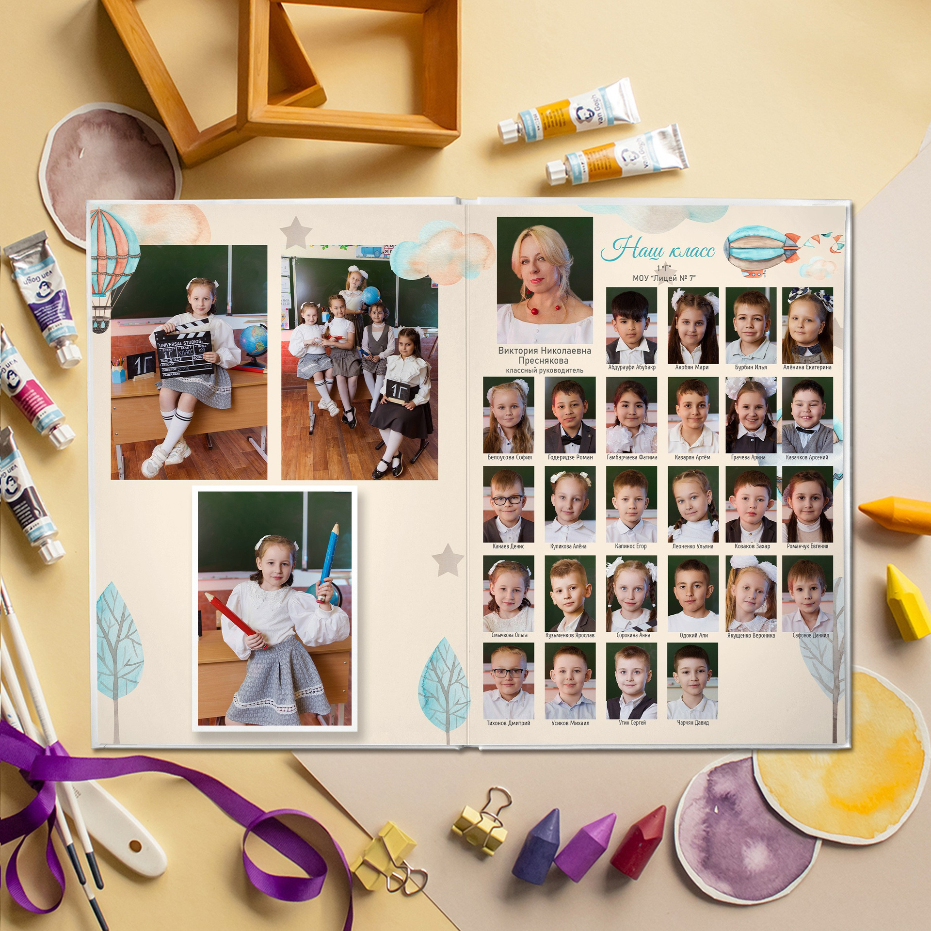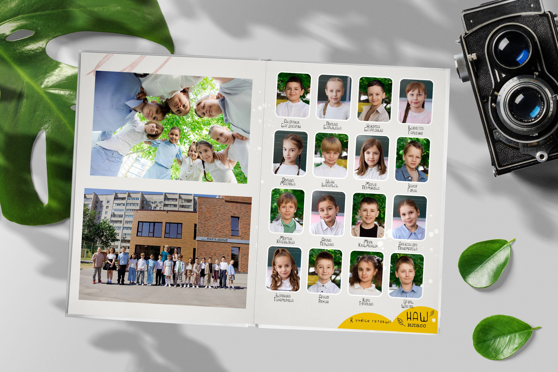- 1 разворот — виньетки (фото классного руководителя и портреты всех детей с подписью фамилий и имён)