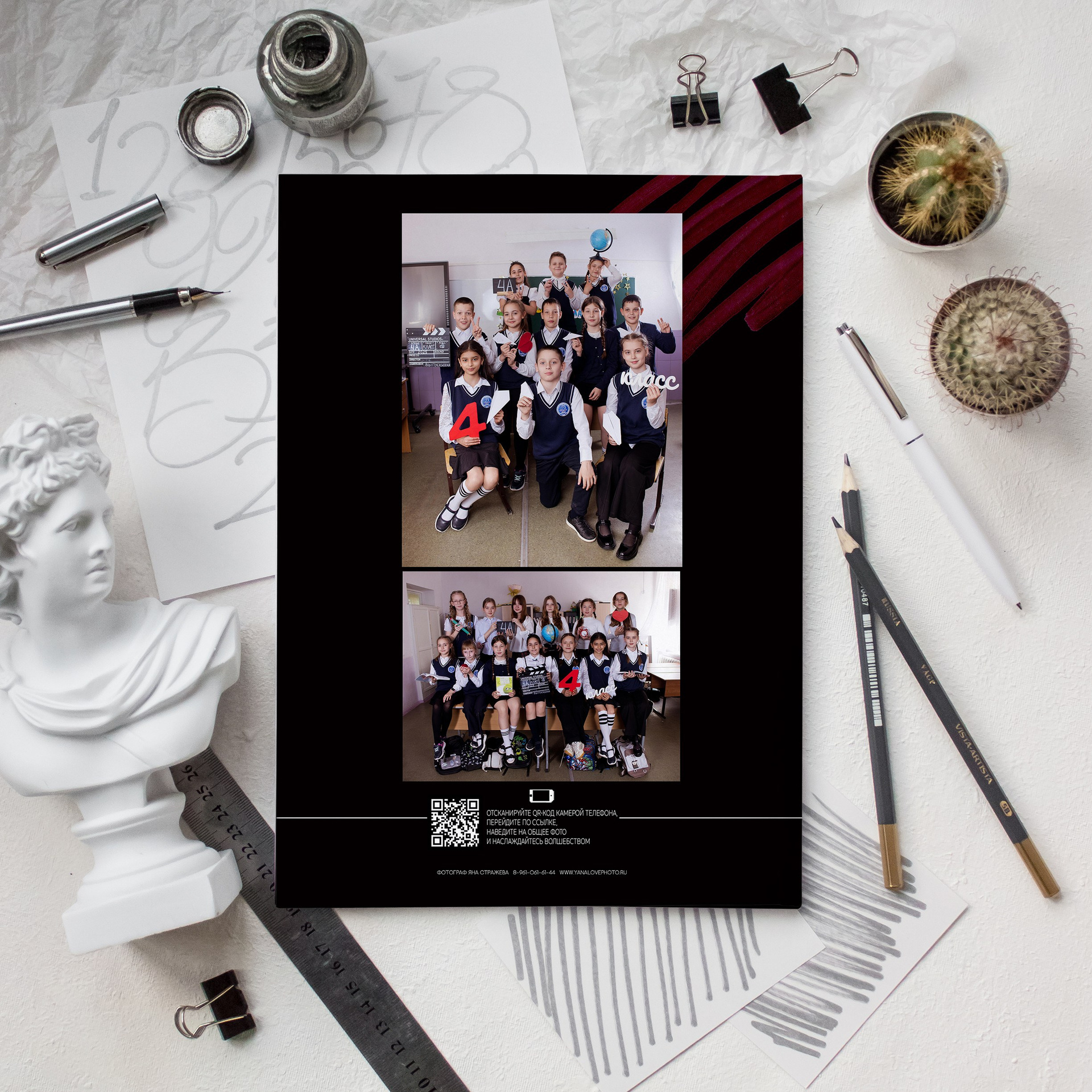 Печать общего фото в рамке с подписью (школа/группа №, год) и с QR-кодом оживающего видео — 400р (По QR коду можно посмотреть короткое видео, наведя камеру телефона на фото)